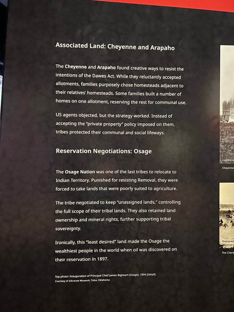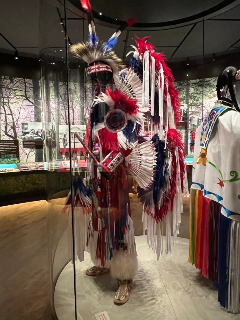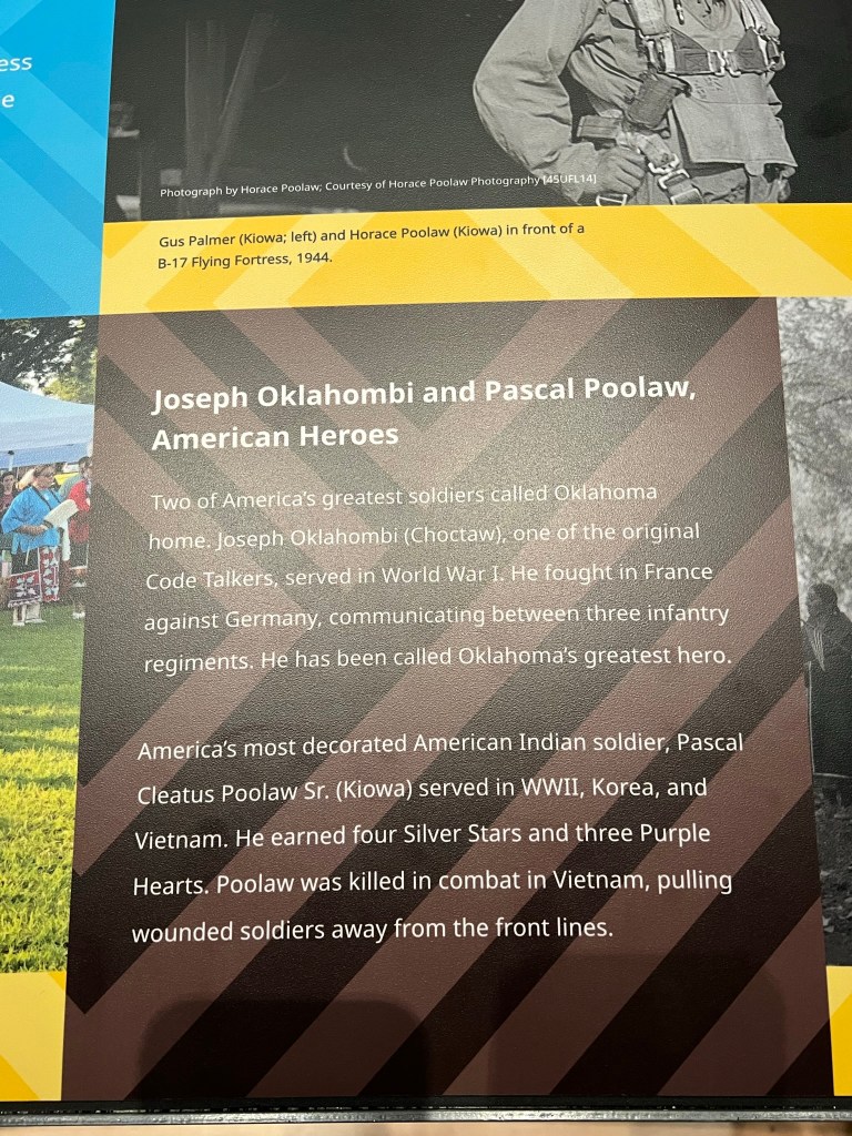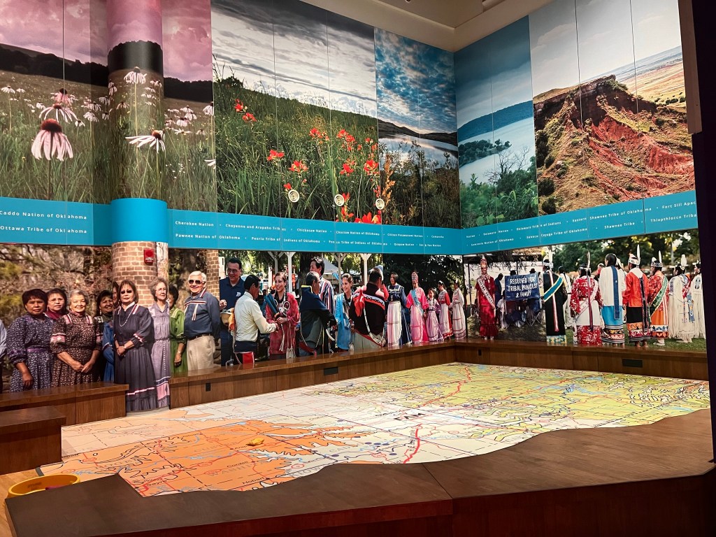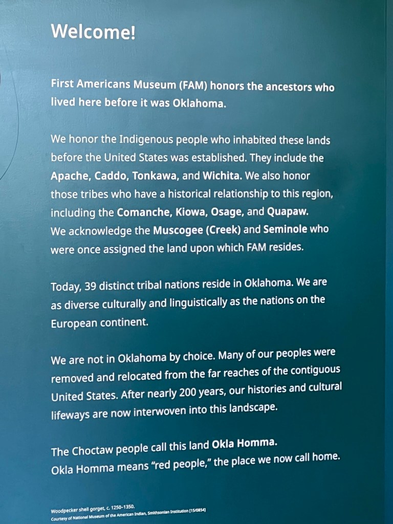 With our cycling goals accomplished, we spent today at two very interesting sites, the First Americans Museum (“FAM”) and the National Cowboy and Western Heritage Museum. FAM shares the history, unique cultures, diversity, contributions and resilience of the 39 distinctive First American Nations now in Oklahoma. Only a few tribal nations were indigenous to what is now the State of Oklahoma. All others were removed from homelands across the contiguous United States to Indian Territory. In 1907, Oklahoma became the 46th state in the union. The State of Oklahoma’s name comes from two Choctaw words, Okla (people) and Humma (red). Translated it means “Red People.” (See our slideshow to learn more.)