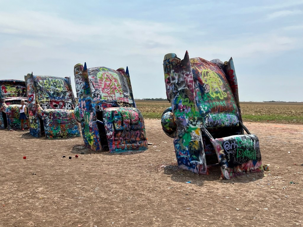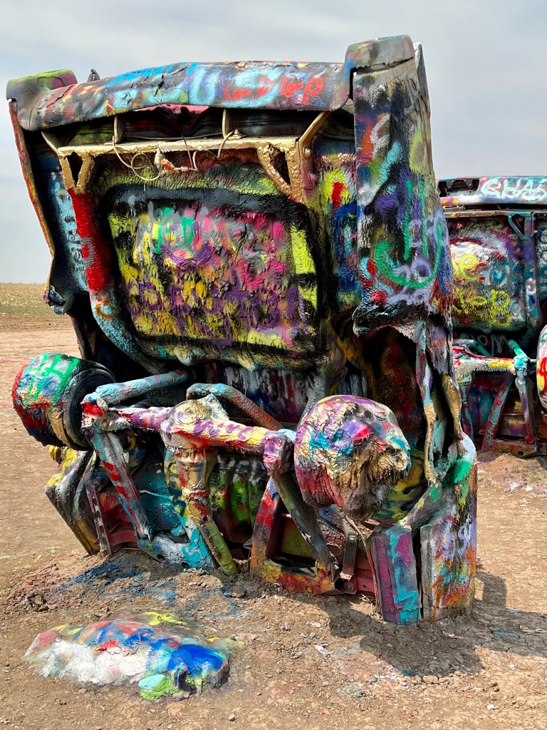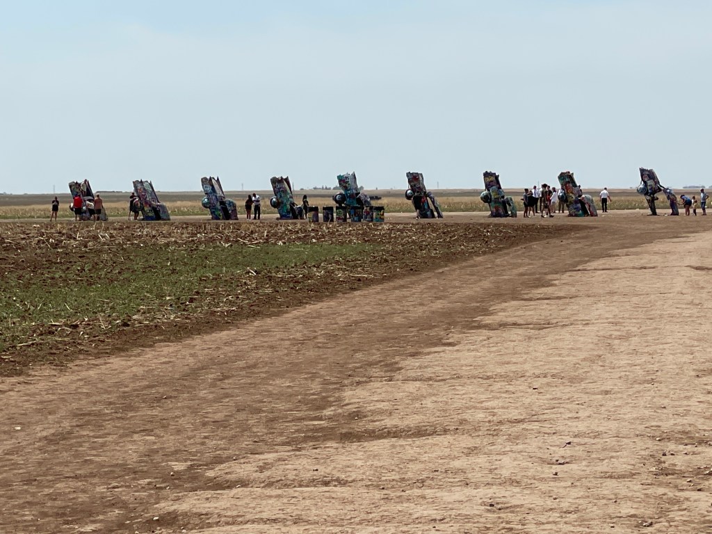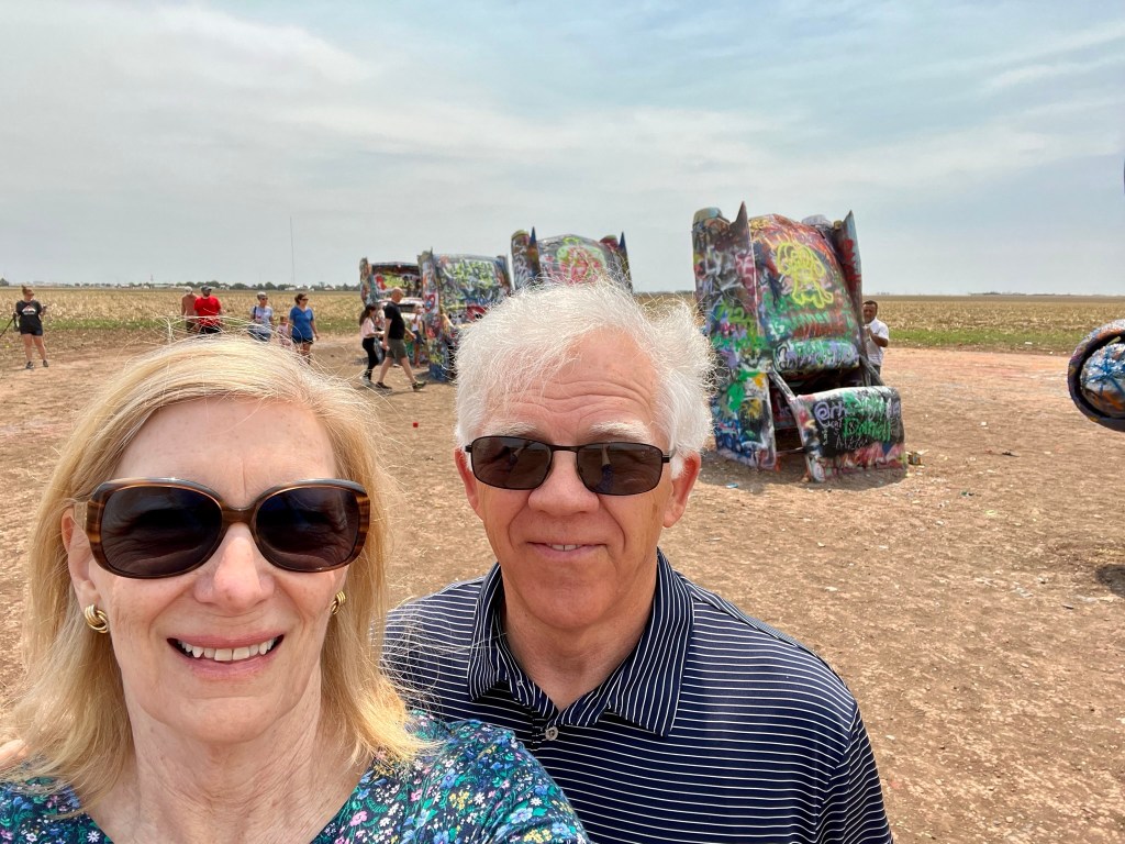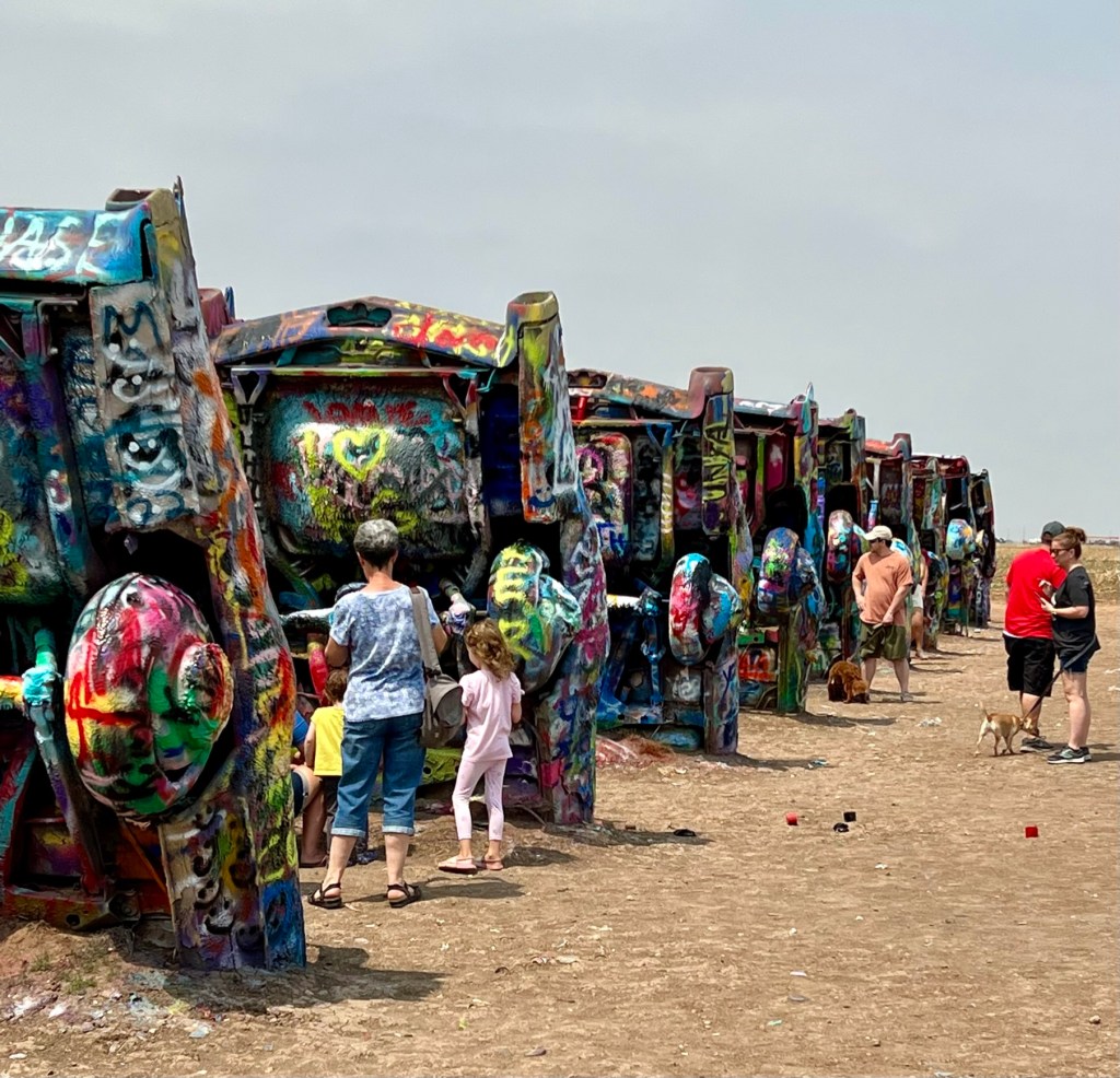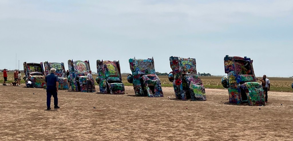 We began the first leg of our journey home this morning. Our route took us through Amarillo, Texas, where we stopped to see a quirky attraction. Standing all alone out in an open field along Route 66 west of Amarillo is Cadillac Ranch. Cadillac Ranch was invented and built by a group of art hippies from San Francisco. Their silent partner, an Amarillo billionaire, wanted a piece of public art that would baffle the local citizens. The hippies proposed an idea to pay tribute to the evolution of the Cadillac tail fin. In 1974, ten Cadillacs were half-buried, nose down, in the dirt. They faced west in a line, from a 1949 Club Sedan to a 1963 Sedan deVille, their tail fins held high for all to see. Years have passed, and now the Cadillacs have been stripped to their frames and spattered in day-glo paint. The smell of spray paint was strong, and sadly, empty paint cans were strewn over the ground. People of all ages were busy spraying designs, names and pictures on the cars. Bill and I watched and wondered…… We were baffled just as the designers had hoped!