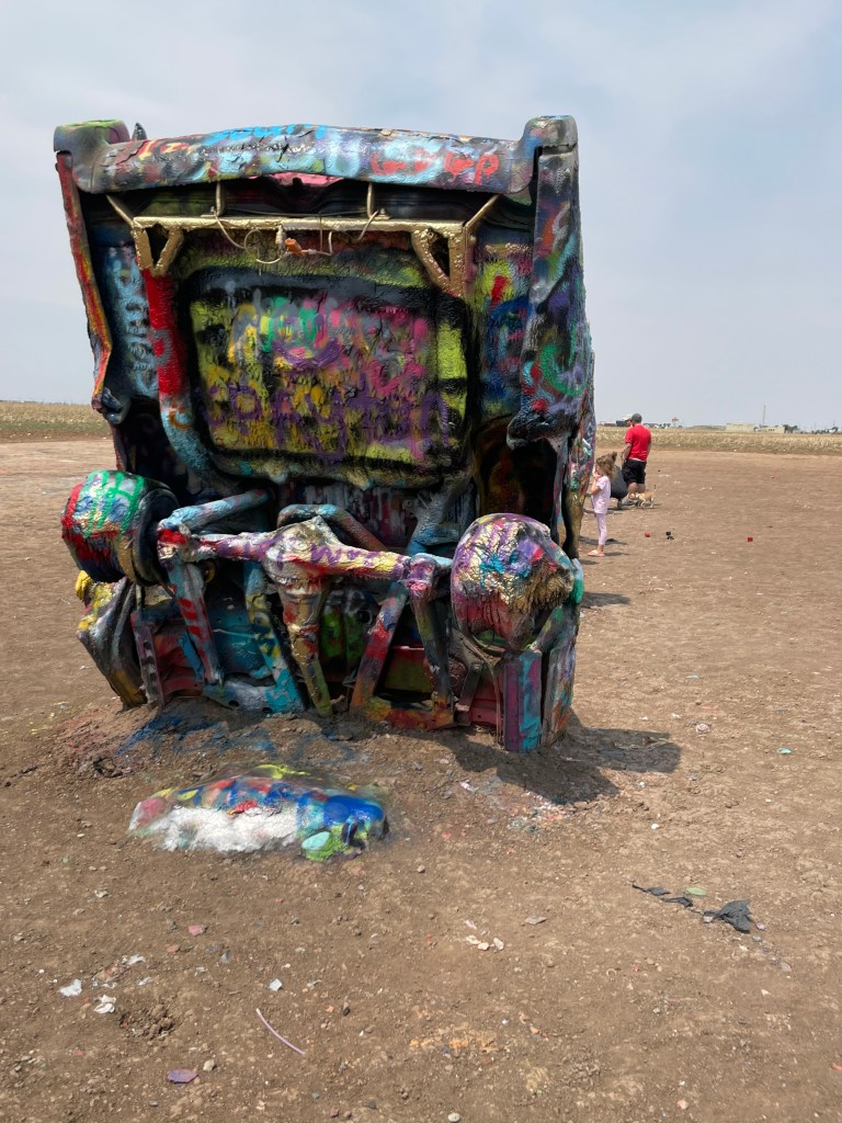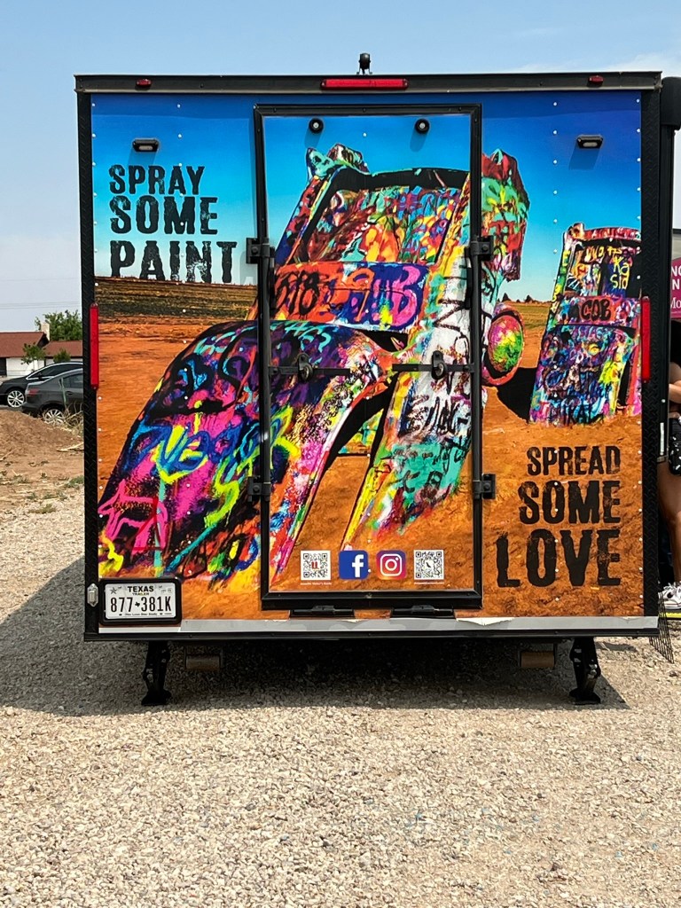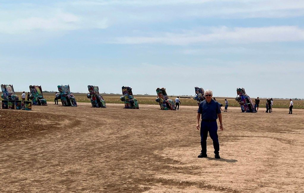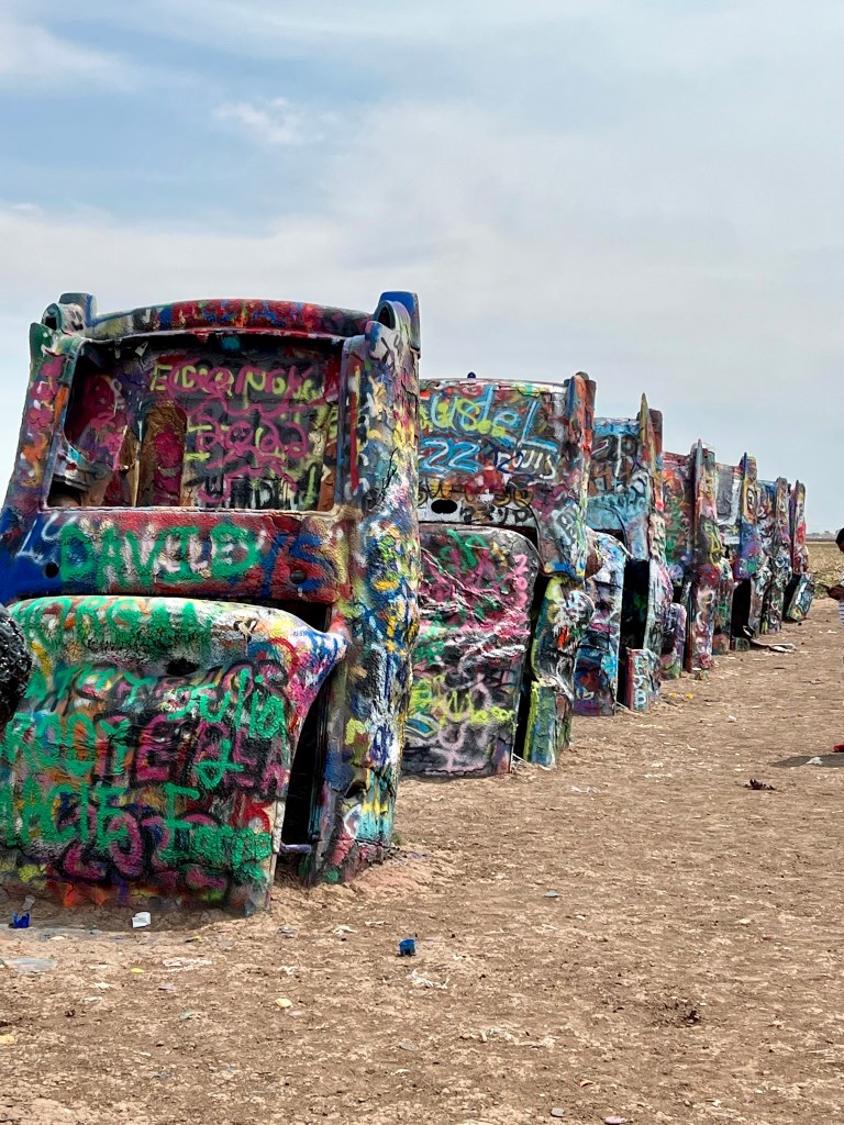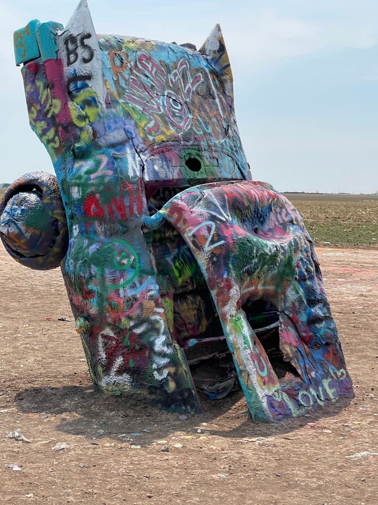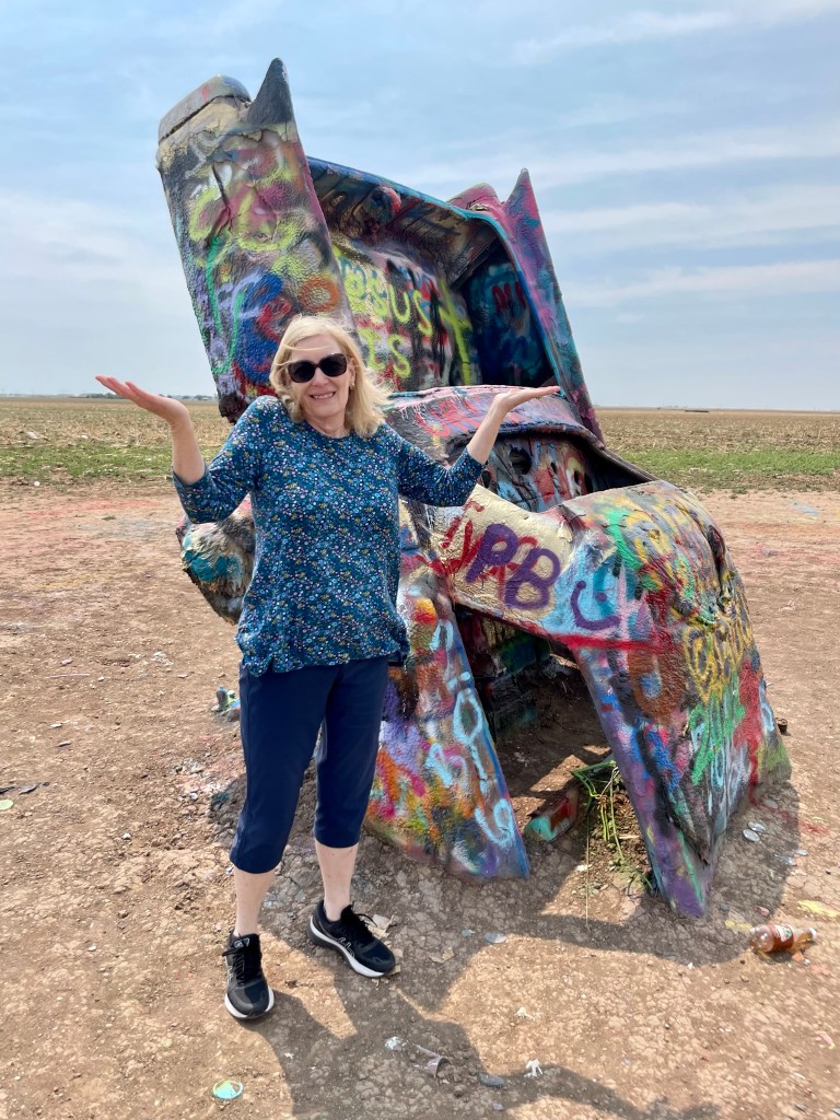 We began the first leg of our journey home this morning. Our route took us through Amarillo, Texas, where we stopped to see a quirky attraction. Standing all alone out in an open field along Route 66 west of Amarillo is Cadillac Ranch. Cadillac Ranch was invented and built by a group of art hippies from San Francisco. Their silent partner, an Amarillo billionaire, wanted a piece of public art that would baffle the local citizens. The hippies proposed an idea to pay tribute to the evolution of the Cadillac tail fin. In 1974, ten Cadillacs were half-buried, nose down, in the dirt. They faced west in a line, from a 1949 Club Sedan to a 1963 Sedan deVille, their tail fins held high for all to see. Years have passed, and now the Cadillacs have been stripped to their frames and spattered in day-glo paint. The smell of spray paint was strong, and sadly, empty paint cans were strewn over the ground. People of all ages were busy spraying designs, names and pictures on the cars. Bill and I watched and wondered…… We were baffled just as the designers had hoped!