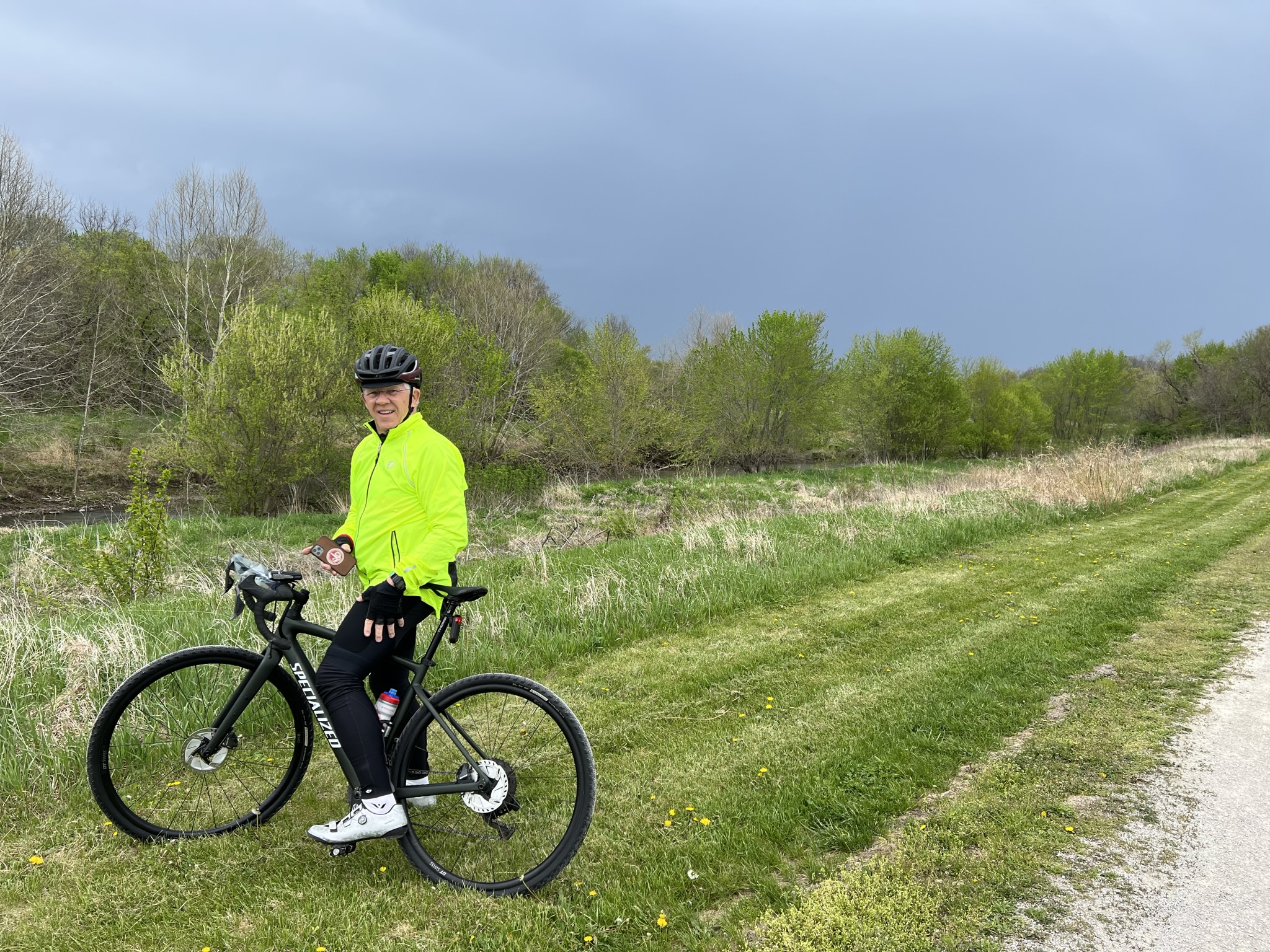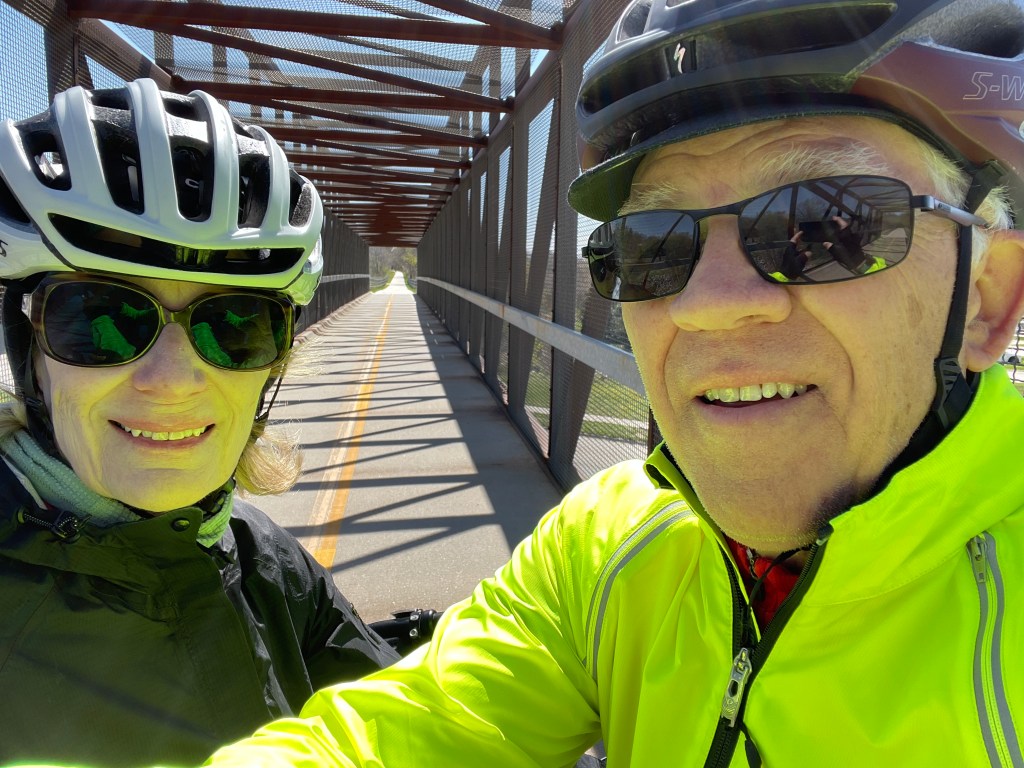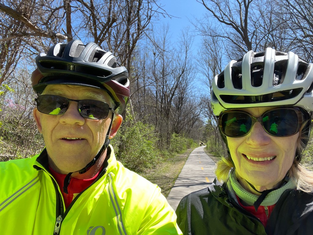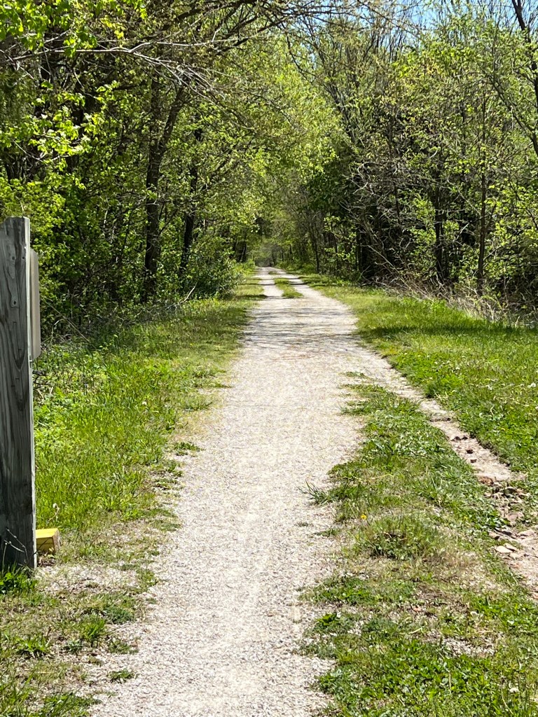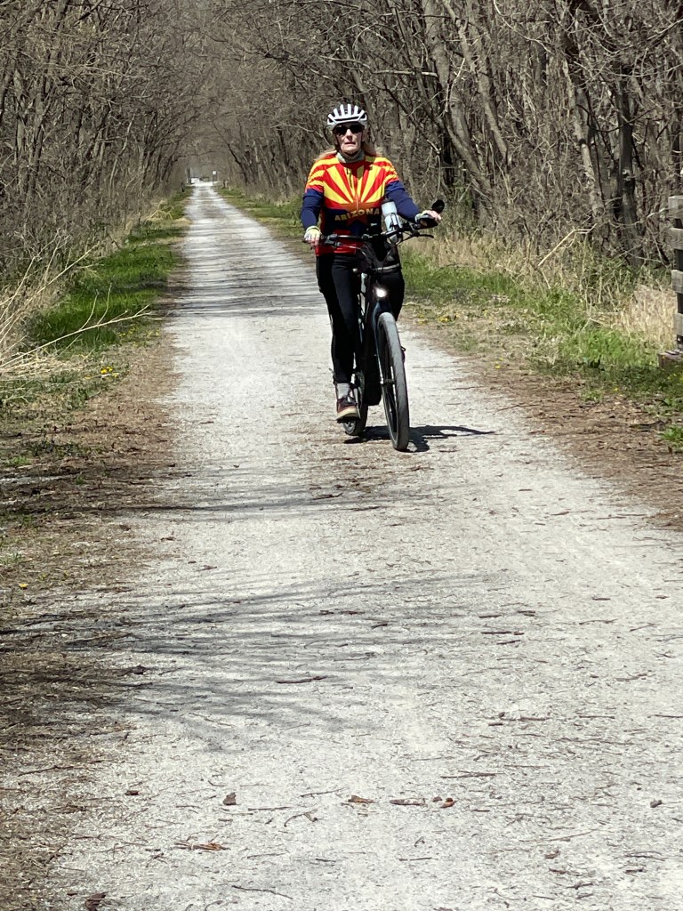 The trailhead was in a rural area south of town. The weather was wonderful! Blue skies, sunshine and mostly gentle wind made the ride very enjoyable! The straight, crushed stone path was lined with trees and shrubs just waking up from winter. We imagined that full foliage would create the feel of riding through a tunnel.