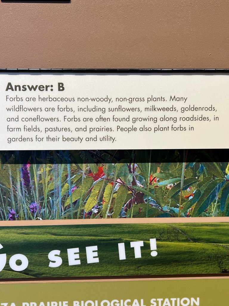 Located in east-central Kansas, the Flint Hills is one of the largest tallgrass prairies left in the world. The prairie continues into northern Oklahoma where it is known as the Osage Hills. The prairie is marked with few trees, wildflowers, and many species of grass. The big bluestem grass can grow as tall as 10 ft. Pioneers used to talk about riding through grasses that were at eye level! Large wild herds of bison (commonly called buffalo) once roamed the plains. Look at our photo gallery for more of the things we learned at the Discovery Center.