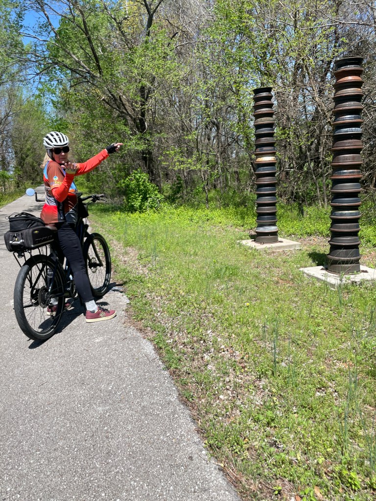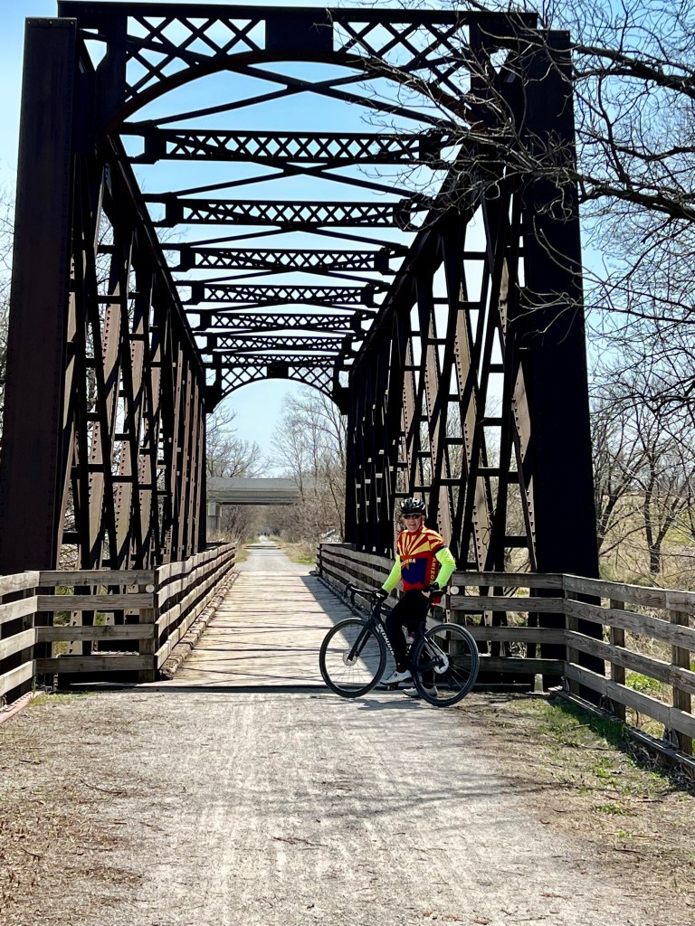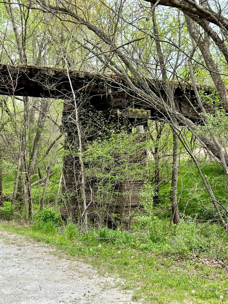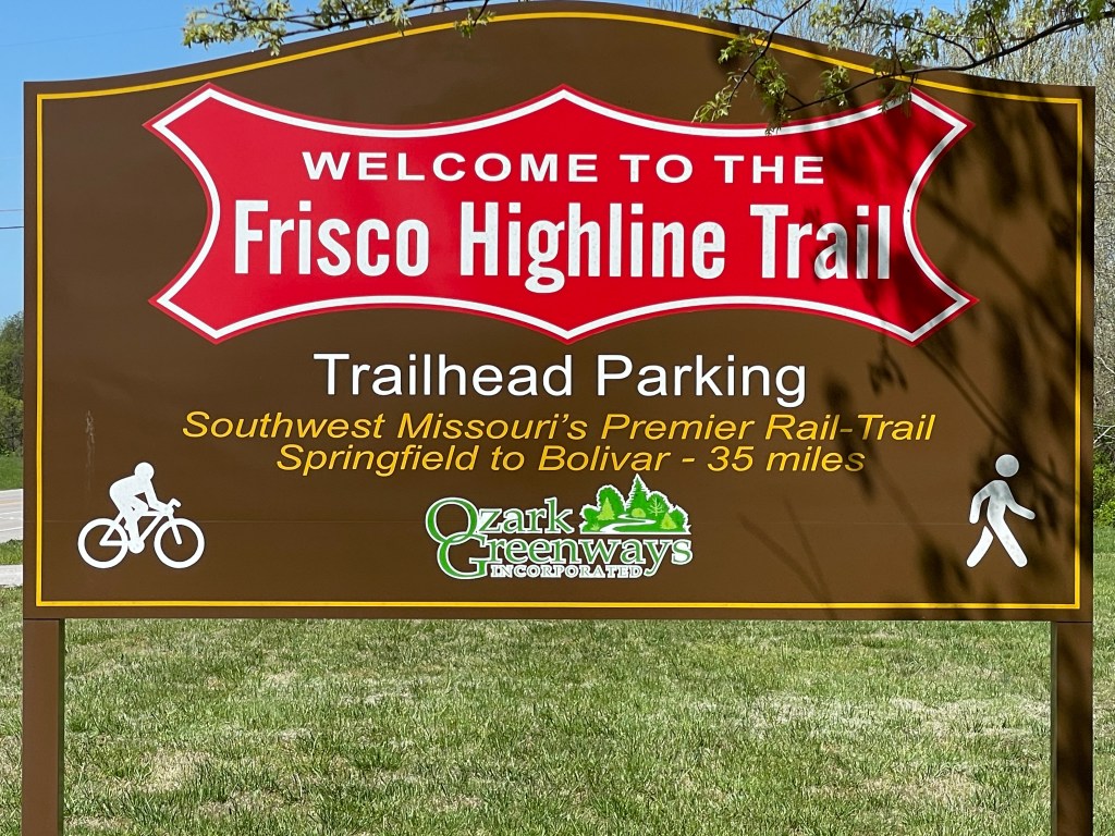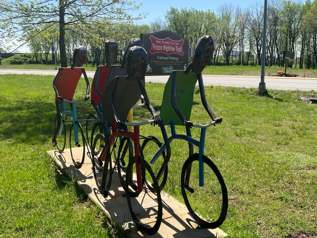 We arrived in Springfield and found the parking lot at the beginning of the Frisco Highline Trail where we planned to ride the 19 miles needed to complete our 50 miles in Missouri. The Frisco Highline Trail is the second longest Rail-Trail in Missouri. In 1948, Harry Truman rode the Frisco Railroad train from Springfield to Bolivar and back in his private railroad car, warming up for his famous “whistlestop” campaign that would get him re-elected as President. The tracks are gone now, the stations have been torn down, and the steam whistle has been replaced by silence or bird songs. The trail winds through woods and pastures, crossing 16 railroad bridges as it passes across two counties in Missouri. We enjoyed every moment of our 20 mile ride on this historic trail!!