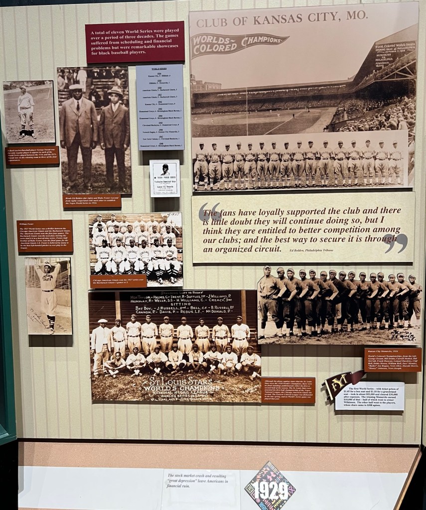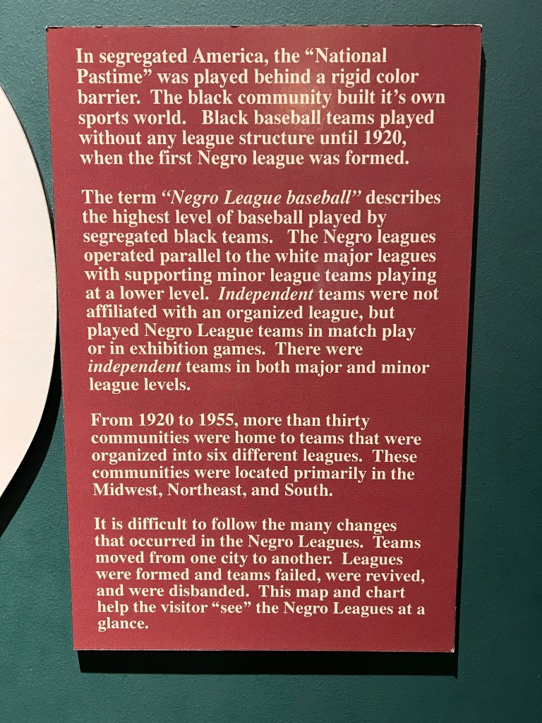 The Negro Leagues Baseball Museum traced the story of the rigid color barrier in the game of baseball. Black baseball teams played without any structure until 1920, when the first negro league was formed. From 1920 – 1955, more than 30 communities were home to teams that were organized into six different leagues. These communities were located primarily in the Midwest, Northeast and South (Birmingham, Alabama was home to the Black Barons).