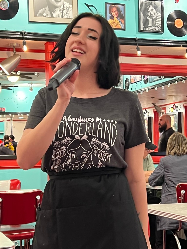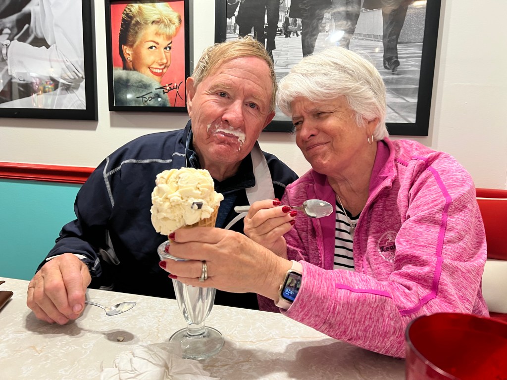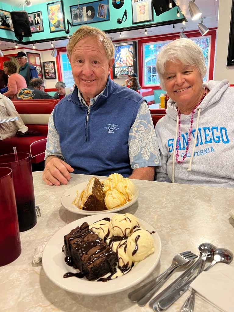 After the sales presentation, we went to lunch at Mel’s Hard Luck Diner, home to very talented singing waiters and waitresses. We also learned the diner is home to HUGE servings of ice cream. Bill ordered a SINGLE scoop of orange sherbet and Joyce, Gordy and Sue ordered single scoop ice cream cones. Were we ever surprised to see scoops of ice cream that were bigger than softballs!! We experessed our amazement, yet, didn’t leave any behind. Furthermore, we liked this restaurant so much we went back later in the week.