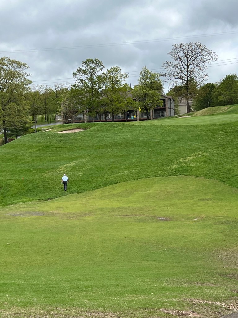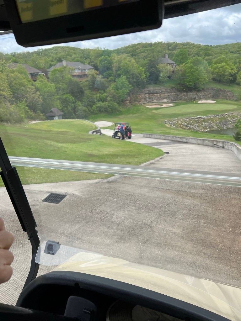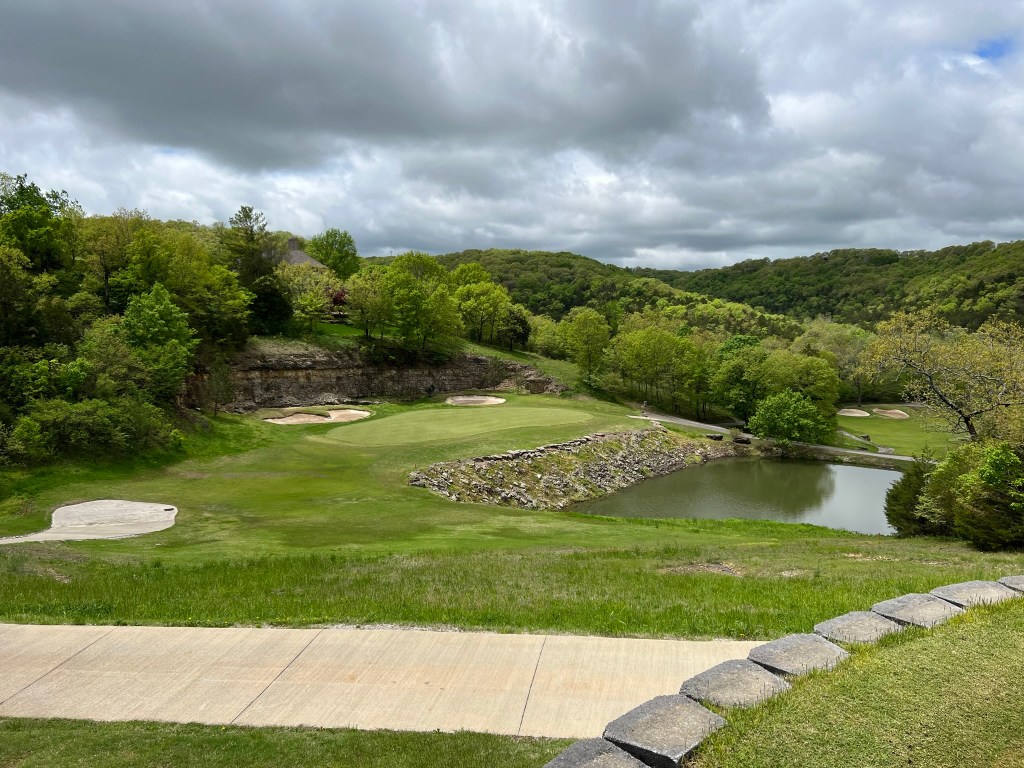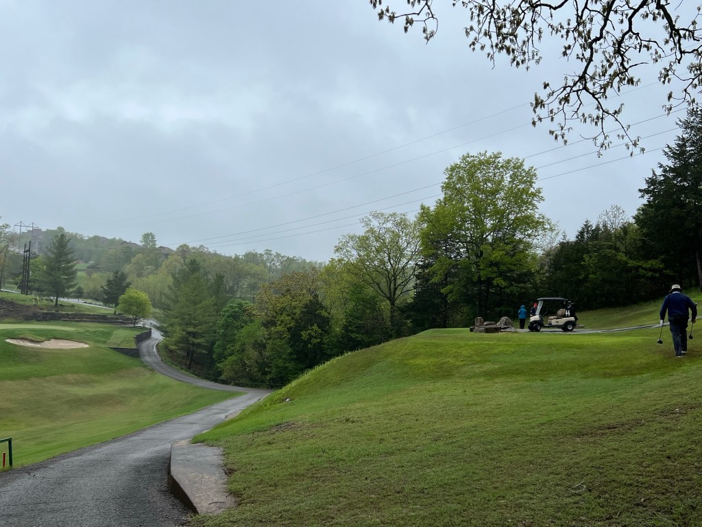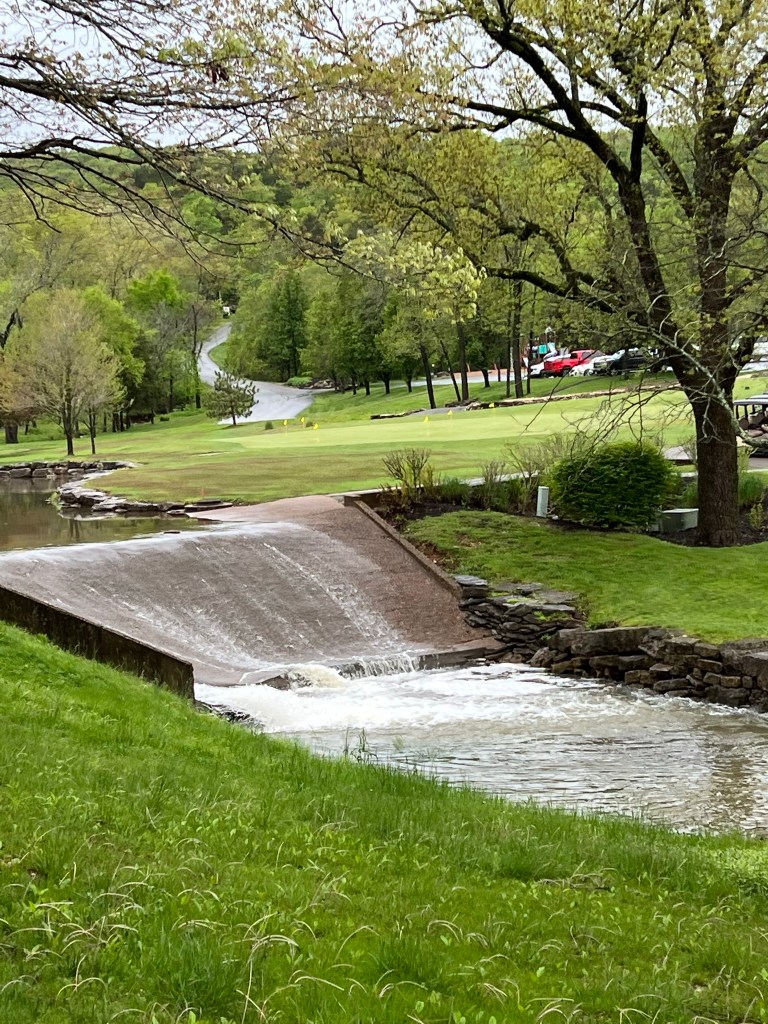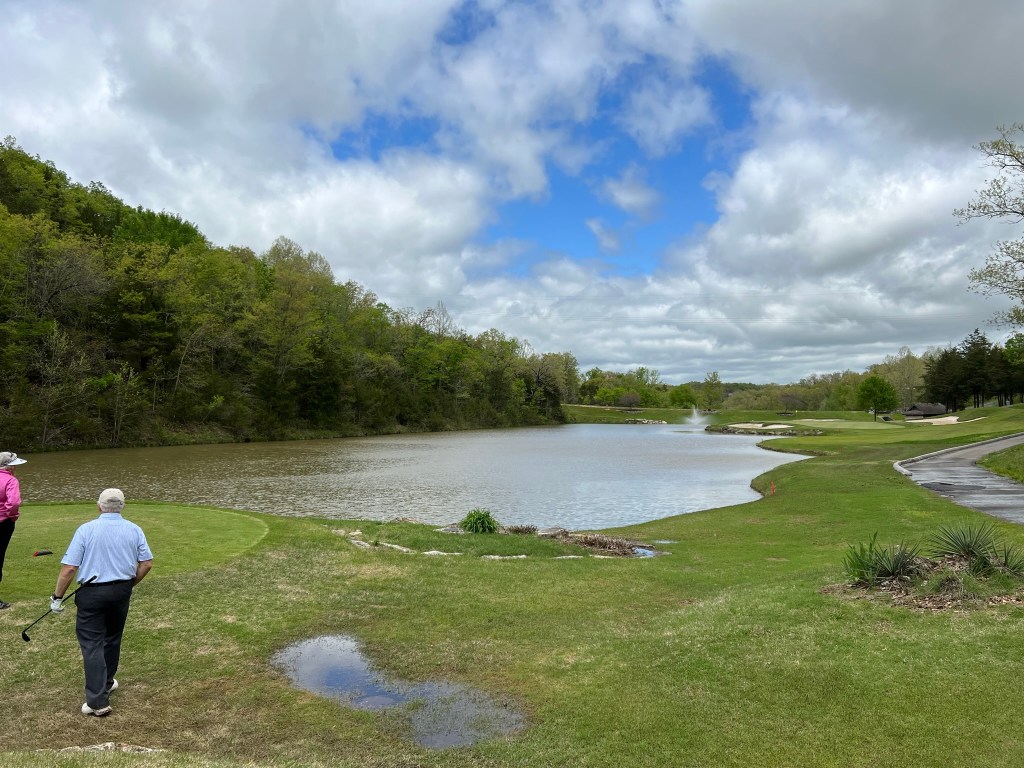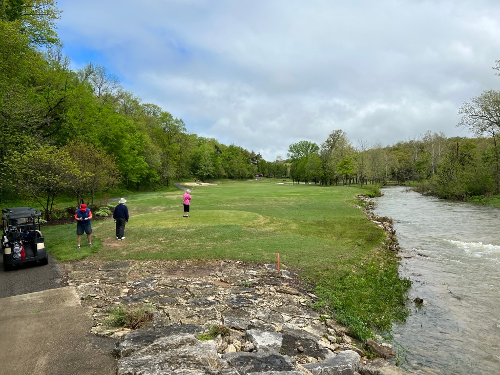 In spite of the generally wet weather, Joyce, Gordy and Bill were able to play two rounds of golf this week. The first was at Branson Hills Golf Course, known as the #1 Best Course to play in Missouri and the 49th Toughest Course in America. Sue gladly served as a cart driver and photographer. The course was very hilly, wet, and windy, and golf carts were restricted to the cart path.