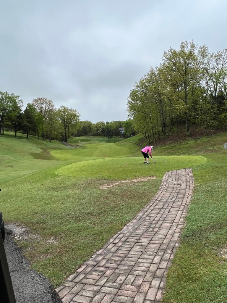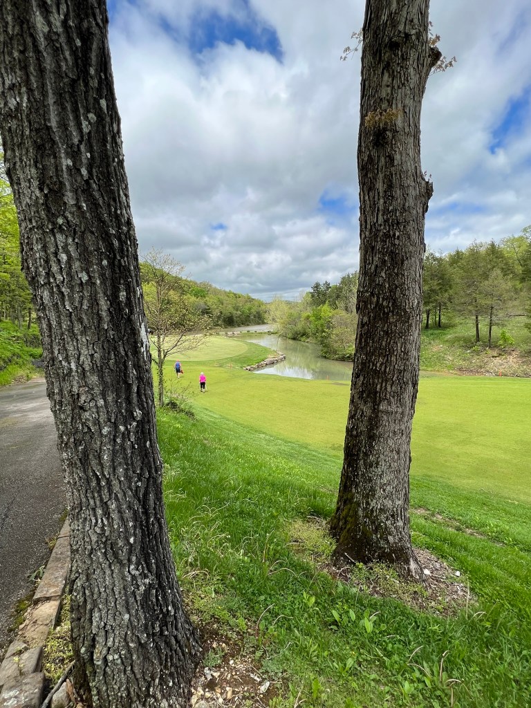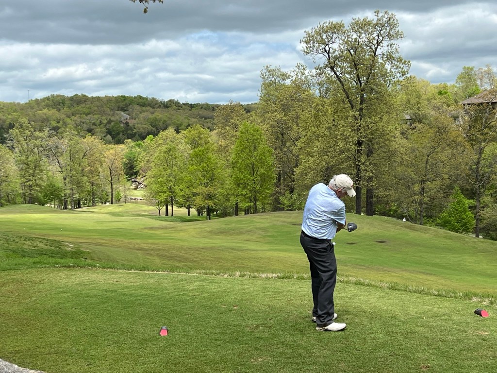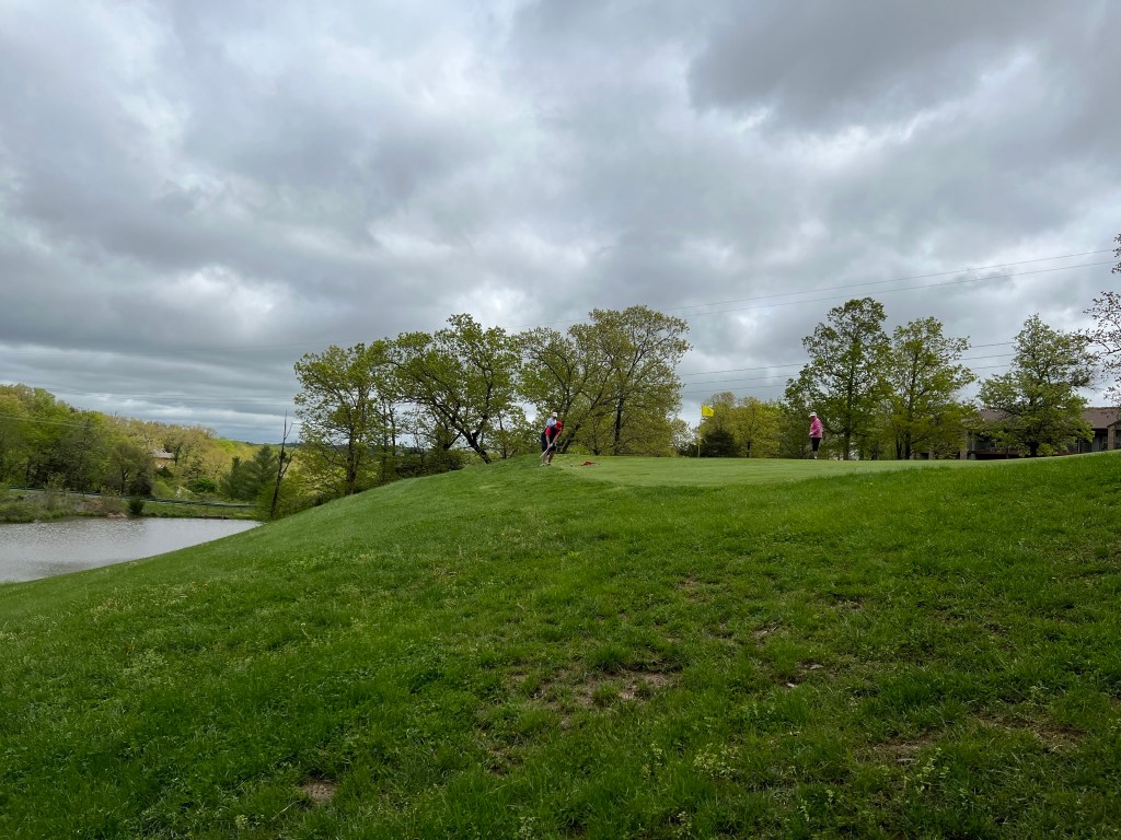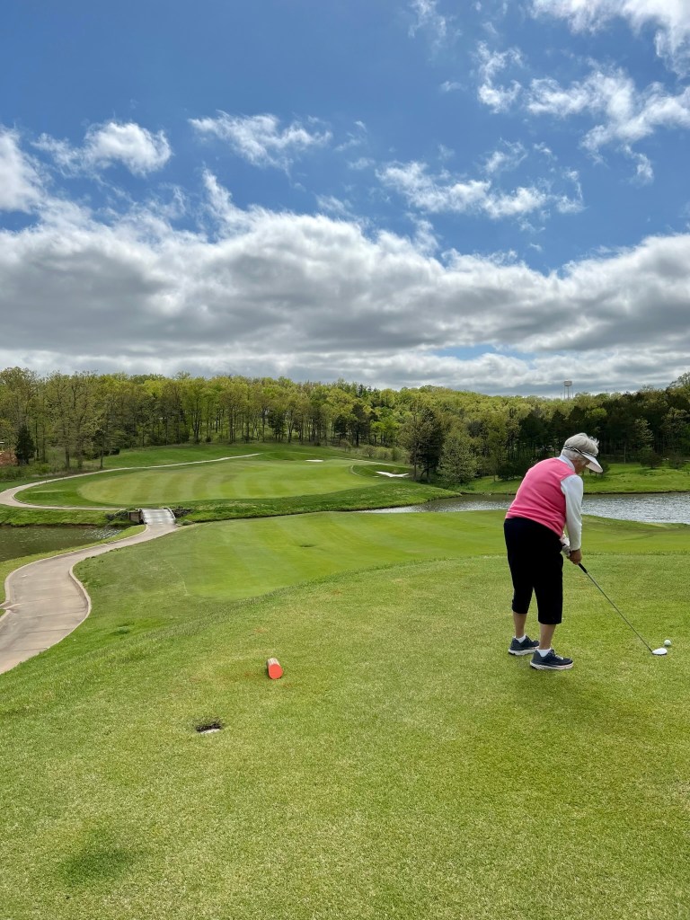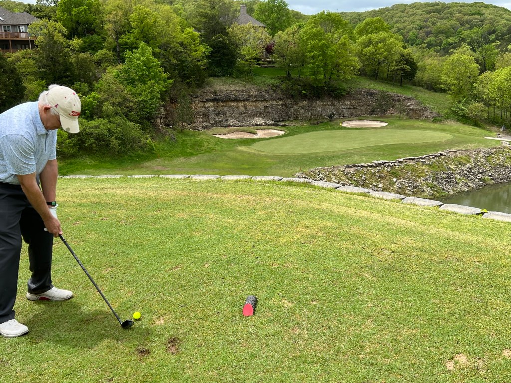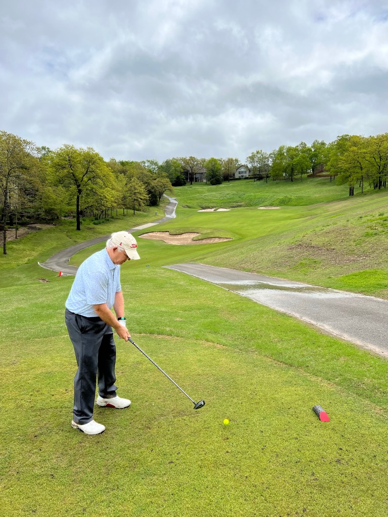 In spite of the generally wet weather, Joyce, Gordy and Bill were able to play two rounds of golf this week. The first was at Branson Hills Golf Course, known as the #1 Best Course to play in Missouri and the 49th Toughest Course in America. Sue gladly served as a cart driver and photographer. The course was very hilly, wet, and windy, and golf carts were restricted to the cart path.