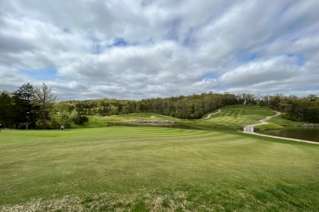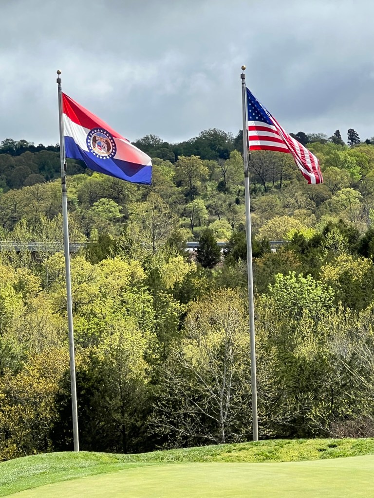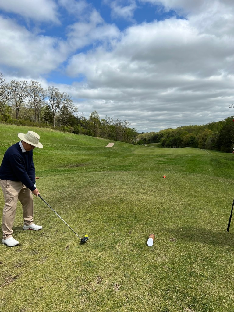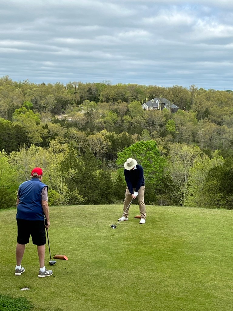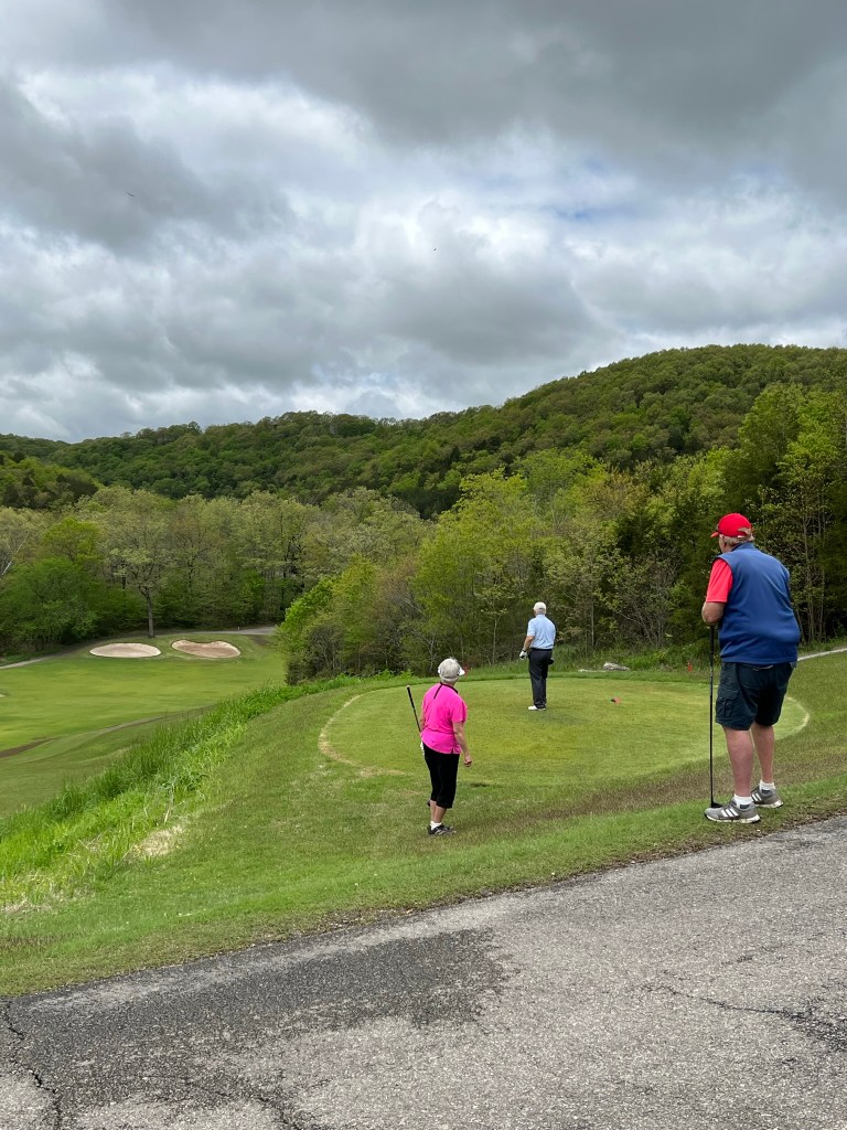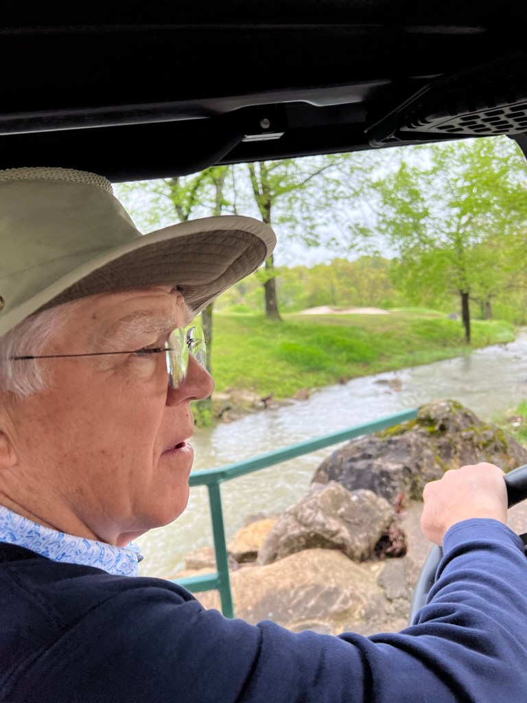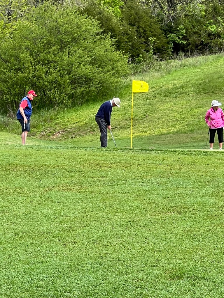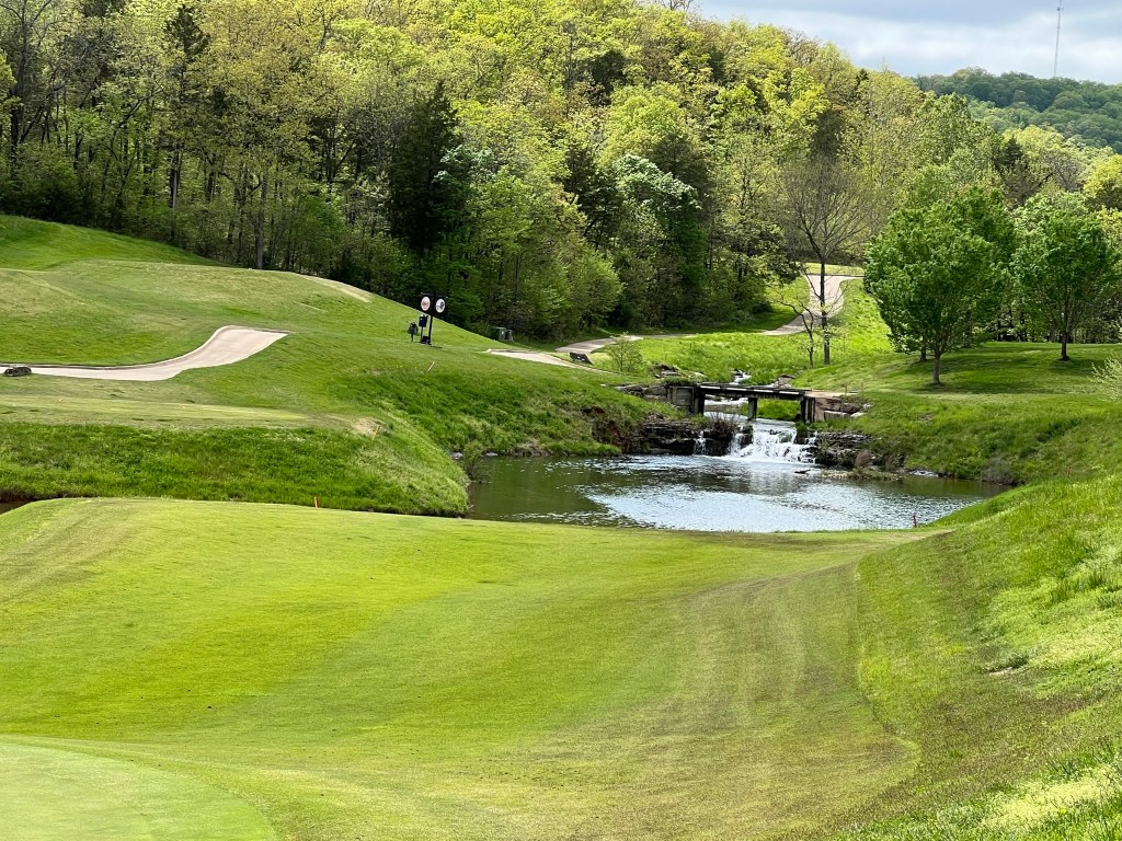 In spite of the generally wet weather, Joyce, Gordy and Bill were able to play two rounds of golf this week. The first was at Branson Hills Golf Course, known as the #1 Best Course to play in Missouri and the 49th Toughest Course in America. Sue gladly served as a cart driver and photographer. The course was very hilly, wet, and windy, and golf carts were restricted to the cart path.