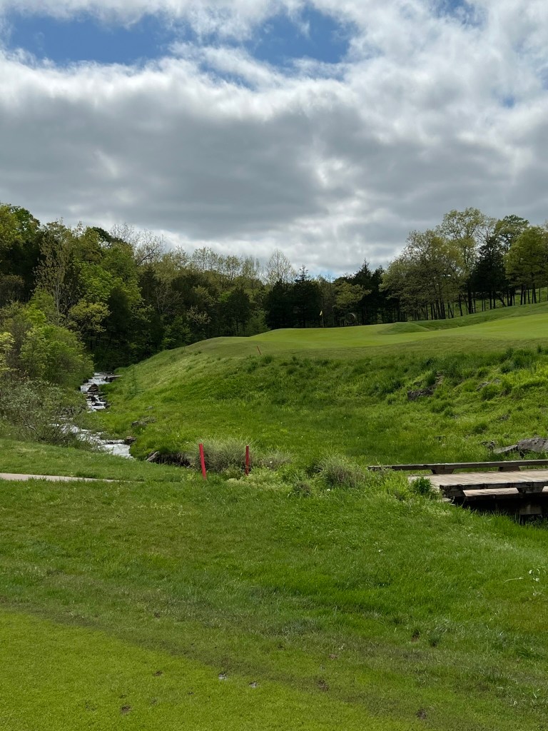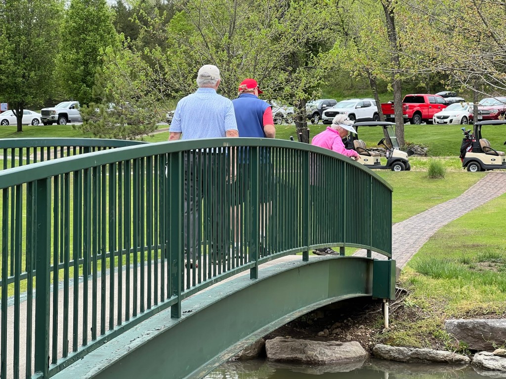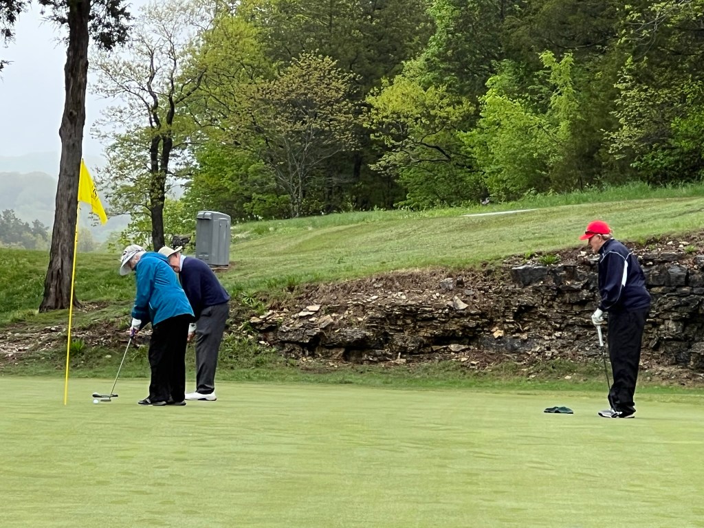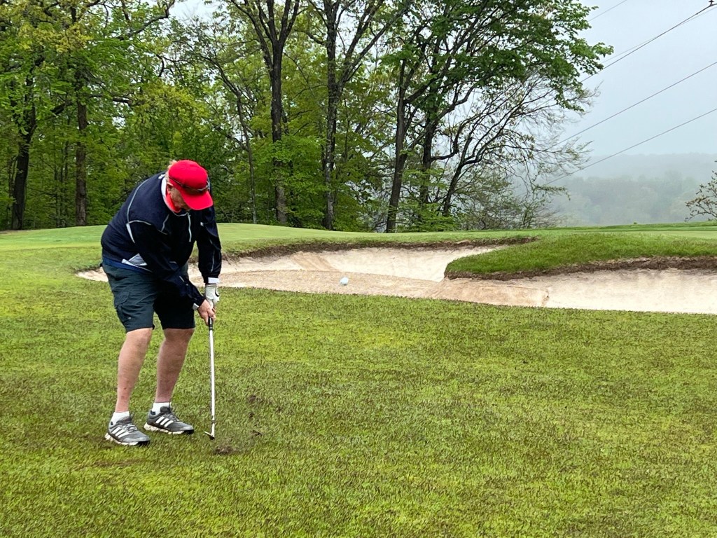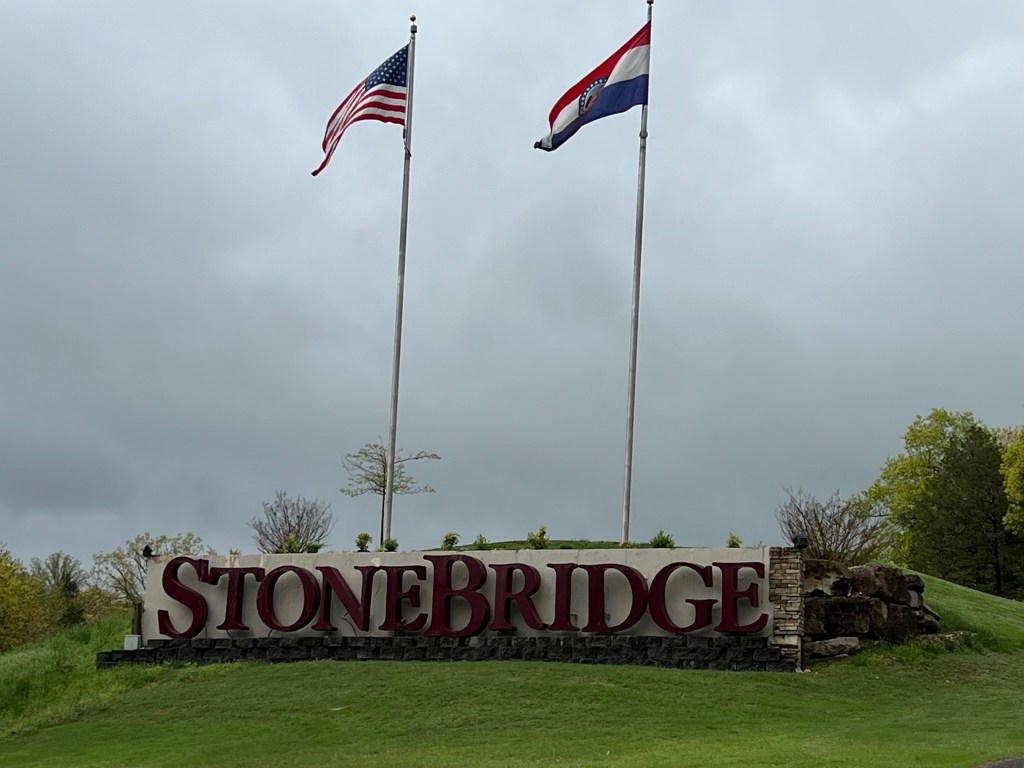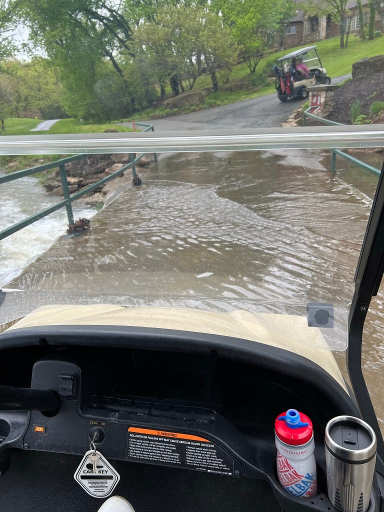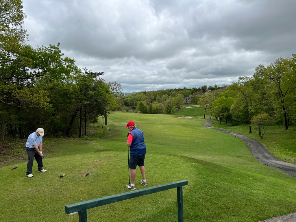 In spite of the generally wet weather, Joyce, Gordy and Bill were able to play two rounds of golf this week. The first was at Branson Hills Golf Course, known as the #1 Best Course to play in Missouri and the 49th Toughest Course in America. Sue gladly served as a cart driver and photographer. The course was very hilly, wet, and windy, and golf carts were restricted to the cart path.