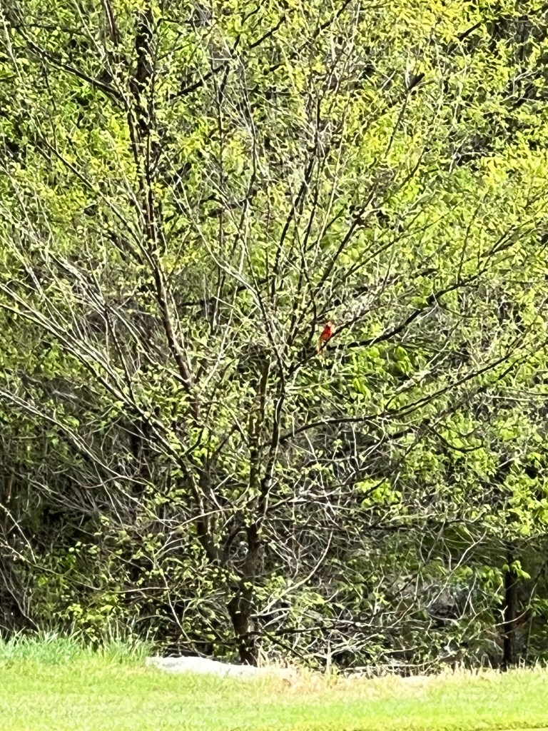 Once again we saw more cardinals than we could count, robins carrying worms in their beaks, small black birds with bright yellow breasts, and two big pheasants beside the trail.